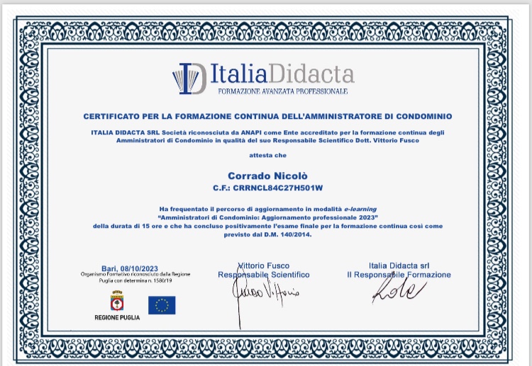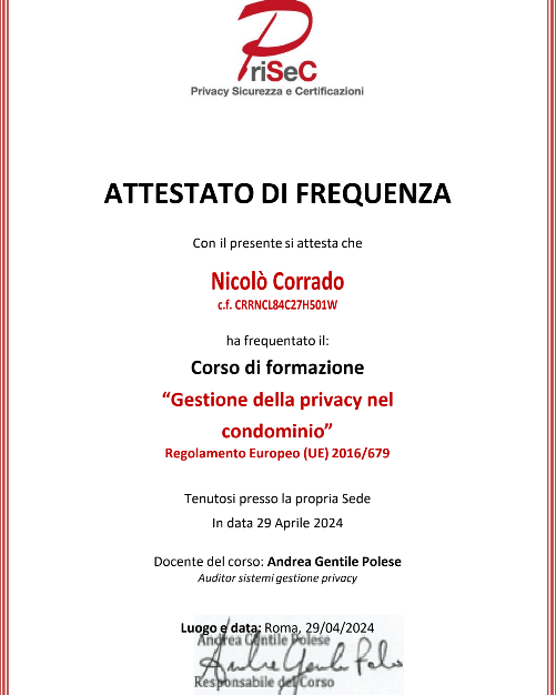 In ottemperanza ai principi di trasparenza che caratterizzano le nostre attività, pubblichiamo in questa pagina gli estratti relativi alla formazione più recente e all’aggiornamento professionale obbligatorio in corso di validità svolto dal responsabile della struttura.